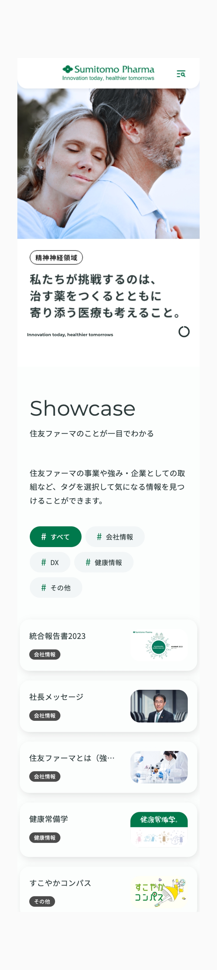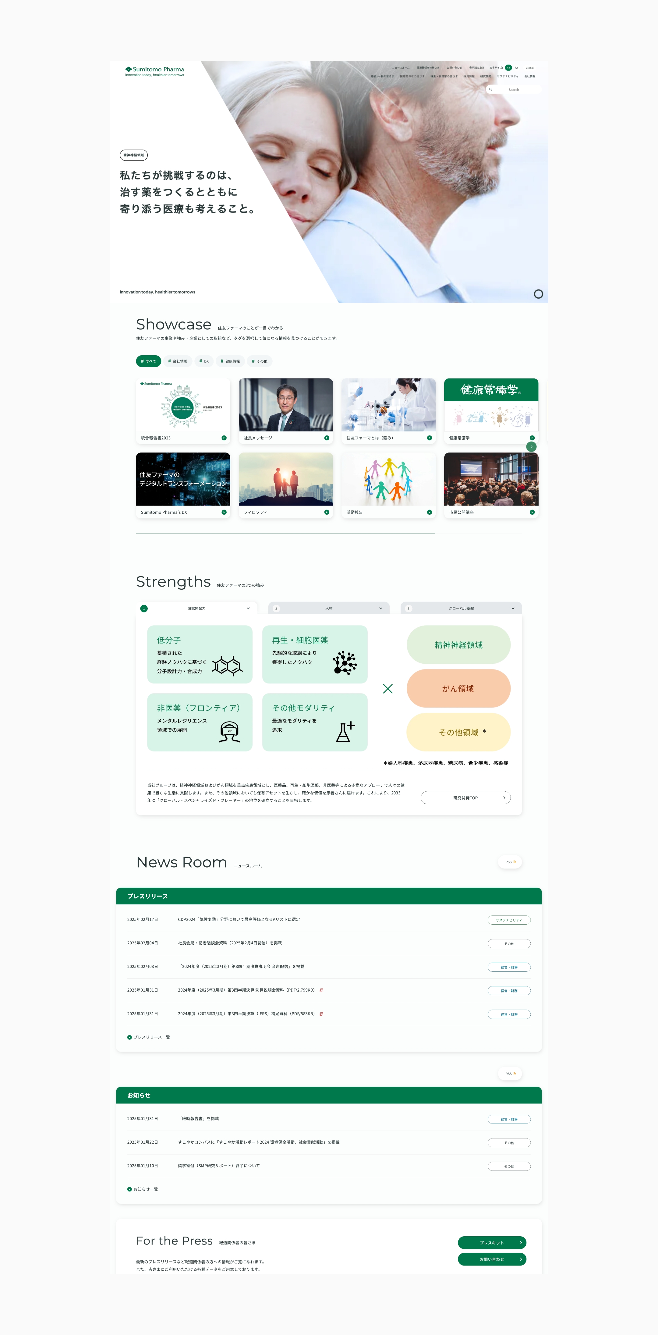 ユーザーの目的や視点を把握することで、当時のサイトのUX視点の課題を顕在化し、本来必要な機能を整理。住友ファーマを理解していただき、応援してもらうことを目指して「挑戦を続ける姿勢と、価値を公正に伝える場所」を開発コンセプトとし、UX改善の優先順位を明確にしたうえで、目的に沿ったクリエイティブの開発、情報設計を行った。
