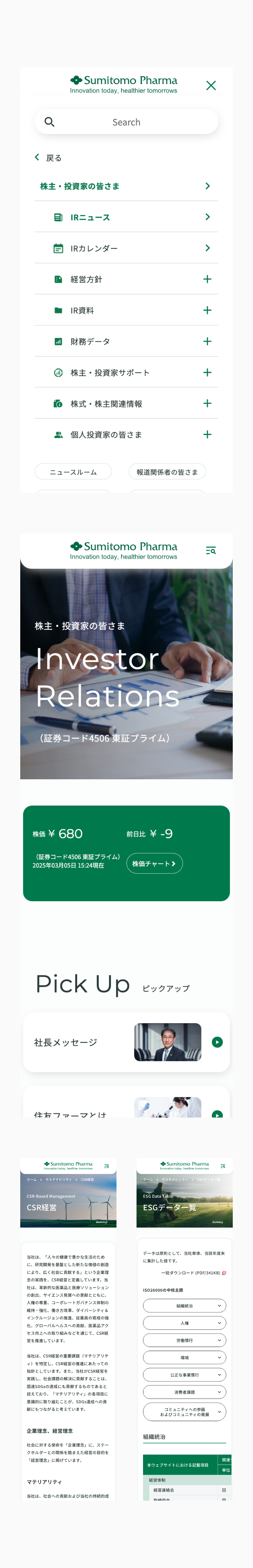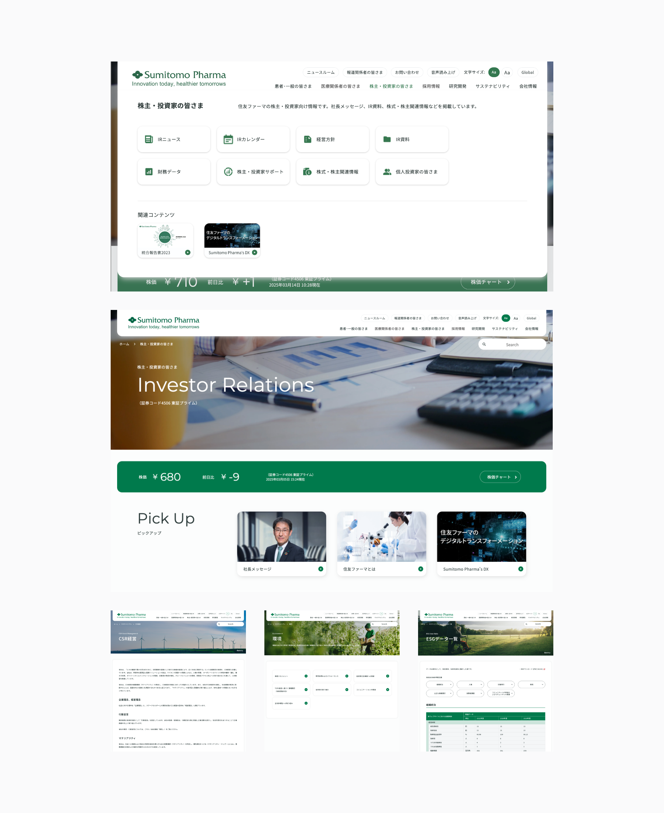開発当時は、コロナ禍の最中で行動が制限される状況であったが、住友ファーマ担当者とはオンラインミーティングによる週2回の定例会を重ね、資料の共有方法にも工夫しながら、ワンチームでプロジェクトを遂行。その結果、統一したブランディングでサイト全体をまとめ、ユーザー視点に立ったUXを実現した情報発信はIR分野の外部評価機関から高い評価を受け、「日興アイ・アール『2023年度全上場企業ホームページ充実度ランキング』」の総合部門、医薬品部門で最優秀サイトを受賞し、そのほかにも多数受賞することができた。