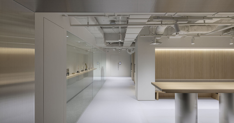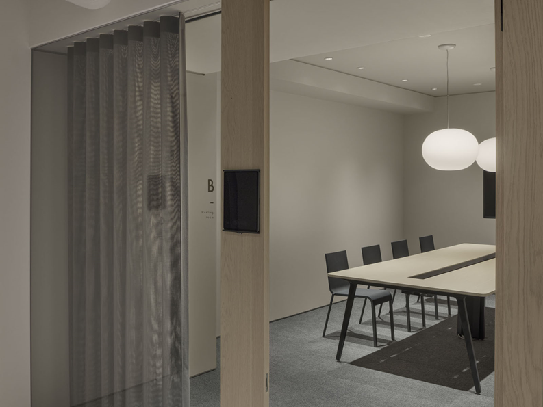 来客エリアは白を基調に、ステンレスやガラス、木などの異素材で構成されています。会議室の壁はやはりクリアなガラスなのですが、来客会議室なので場合によっては中を見られたくないこともあります。