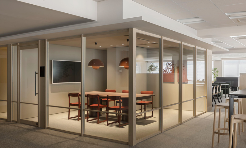 広い執務エリアにランダムに4つ点在する箱型の会議室です。