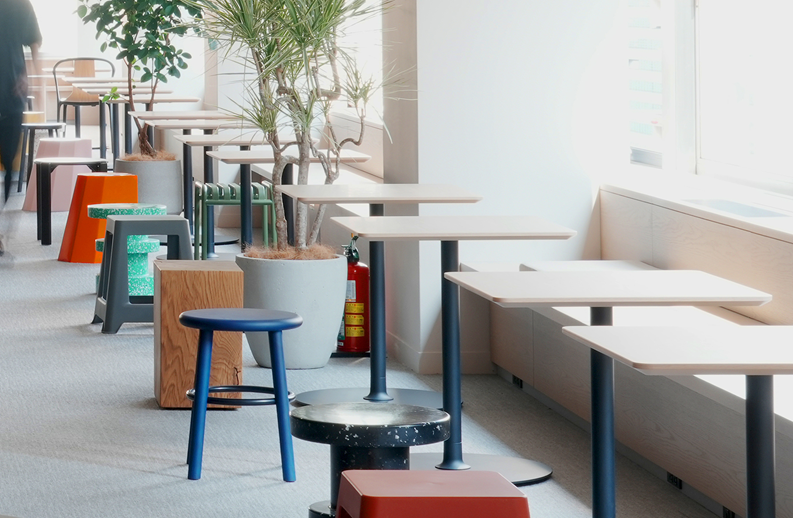 このベンチの向かいに様々なスツールを点在させているのですが、これ、1つも同じものはありません。ちょっとしたアクセントとして全部違うものを調達していただきました。