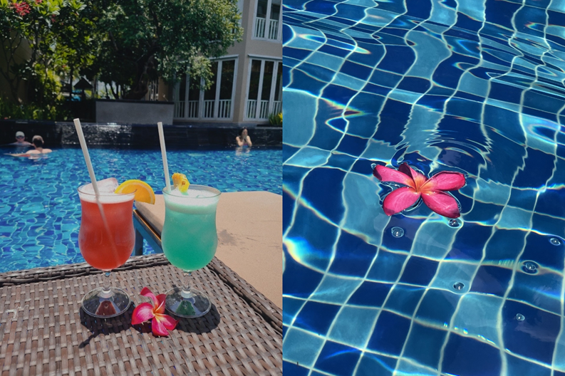 結果...大正解!部屋も文句無しにキレイで、窓からはプーケットの素敵な景色がわ〜っと広がってうっとり。そして、何よりもプールです!滞在中は、朝からプールで映えカクテルを堪能。プールに浸かって気持ちよく涼みながら暑さを凌いでいました。
