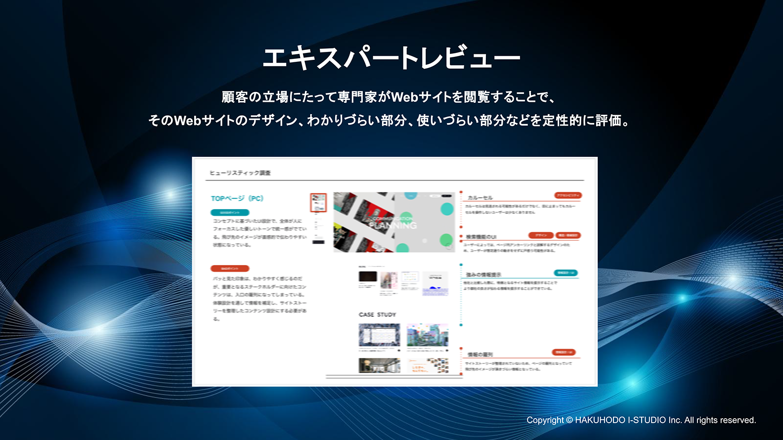 エキスパートレビュー: 専門家の視点から、Webサイトの構造、ナビゲーション、コンテンツの配置、ユーザビリティを評価し、潜在的な問題点(ボトルネック)の洗い出しを行います。