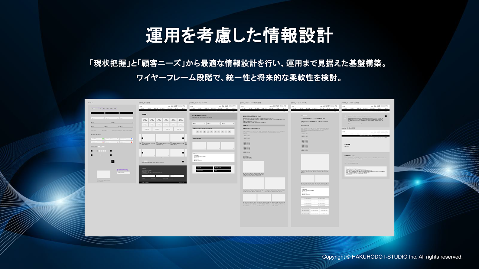 このコンポーネント管理に基づき、ページごとの情報配置、機能、導線を定義するワイヤーフレーム(骨子)を設計します。