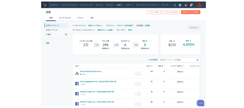 HubSpotの「キャンペーン」機能は、まさにROIを算出するために設計されています。