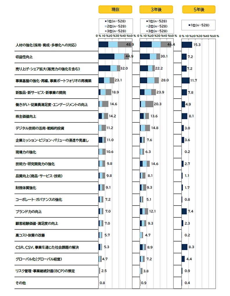 ある調査によれば、企業が抱える経営課題として「人材の強化(採用・育成・多様化への対応)」は、現在(48.9%)、3年後(46.4%)、5年後(15.3%)のすべての期間において、常に上位に挙げられています。特に「現在」の課題としては、「収益性向上」(44.9%)や「売り上げ・シェア拡大」(32.0%)を抑えて、最も重要な課題として認識されているのです。