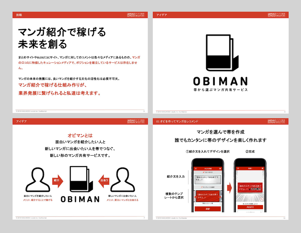 池田:受賞時の当社のアイデアは「OBIMAN」というものでした。これは面白いマンガを紹介したい人と、新しいマンガに出会いたい人が、帯(OBI)でつながるマンガ共有サービスだったんです。書籍の帯や、書店のポップのようなかたちで、読者がWeb上でマンガを宣伝する。