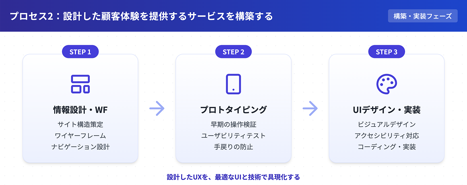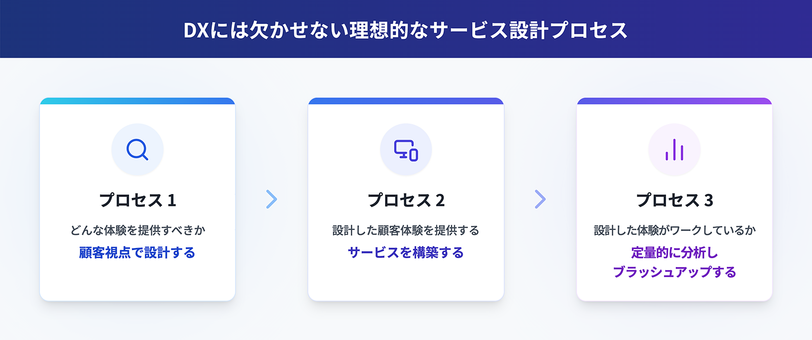 私たちは、DXにおけるサービス設計を以下の3つのプロセスに大きく分類しています。