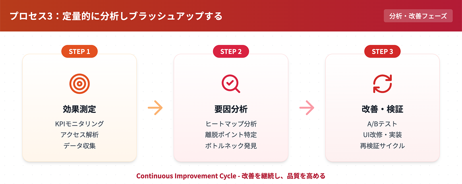 このフローは一方通行ではなく、プロセス3の結果をプロセス1にフィードバックし、常にサービスを成長させ続ける「循環型」のモデルであることが理想です。次章より、各プロセスの具体的な手法とポイントを解説します。