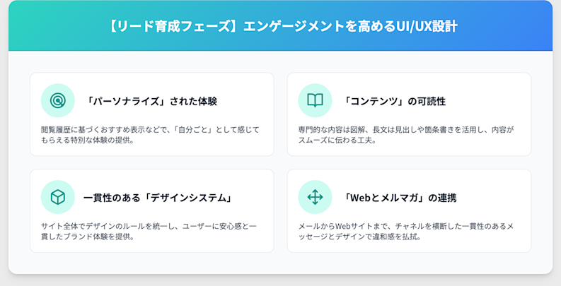リード獲得はゴールではなく、長期的な関係性のスタートです。獲得したリードとのエンゲージメント(信頼関係)を高め、顧客へと育てるためのUI/UXのポイントです。