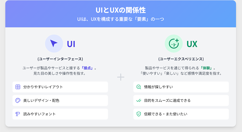UIとは「User Interface」の略で、ユーザーと製品・サービスとの「接点」のすべてを指します。Webサイトにおいては、レイアウト、ボタンのデザイン、文字フォントなど、ユーザーが視覚的に認識し、操作する要素全体がUIにあたります。UX(ユーザーエクスペリエンス)とは?ユーザーの「体験」