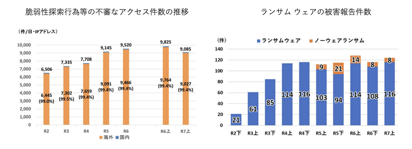 まず、2025年現在、国内のサイバー攻撃において最も多い攻撃は、不正アクセスです。次いでランサムウェア攻撃になるのですが、数としては、ランサムウェア攻撃の3倍の不正アクセス攻撃があります。ランサムウェア攻撃も不正アクセスを起因とすることが多く、ランサムウェア被害にあわないためには、不正アクセス対策が重要です。