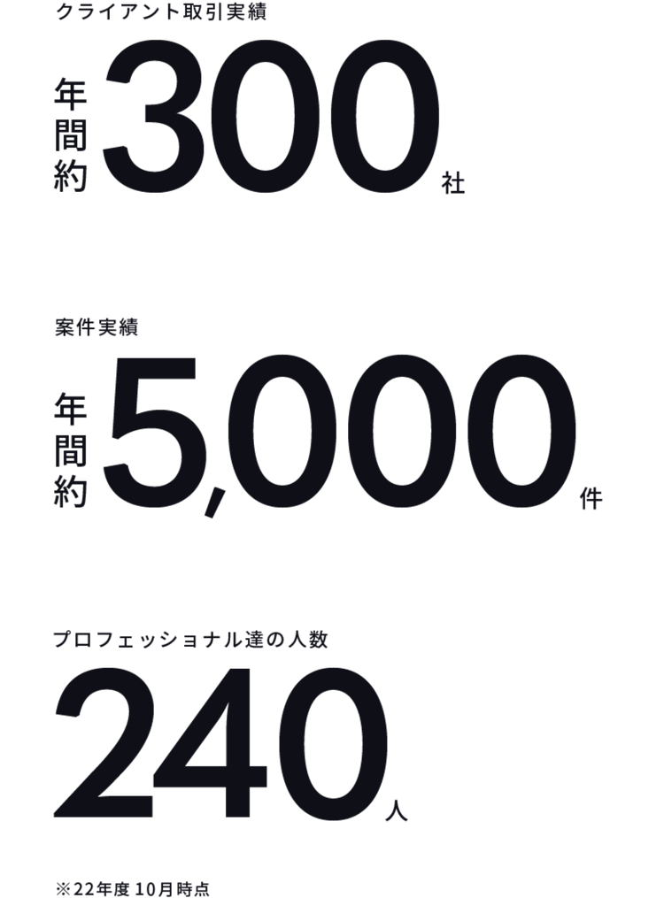 年間約300クライアント、5,000件の多種多様な制作実績で得た様々なプランニング・制作・進行ノウハウを全社でナレッジ化する仕組みを有しているため、プランニングやテクノロジーを中心とした設計のフィジビリティ精度や、制作進行・開発実施の再現性が高いです。